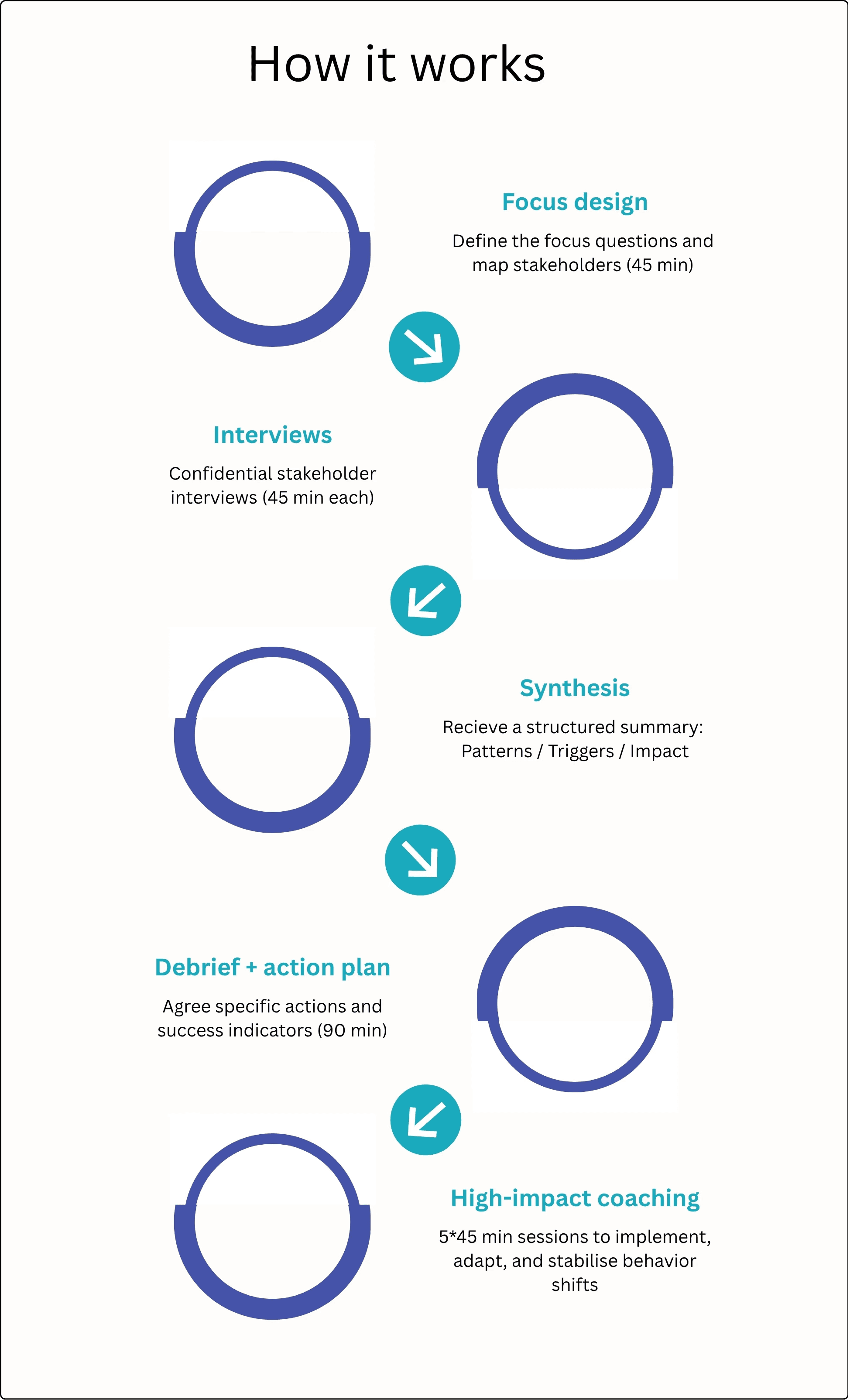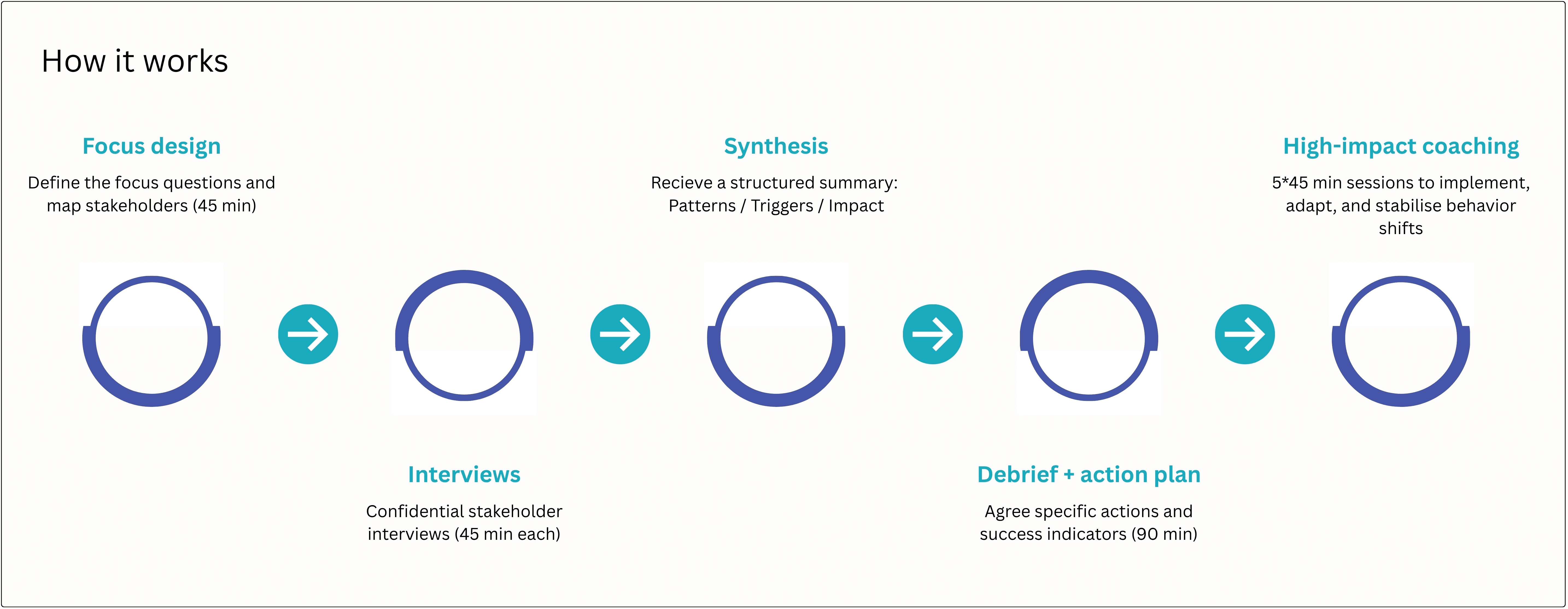 Der Leadership Impact Review (LIR) ist ein vertraulicher, interviewbasierter Feedbackprozess für Führungskräfte. Anstatt eines standardisierten Fragebogen einzusetzen, der ggf. nicht die für die einzelne Führungskraft individuell wichtigen Themen behandelt. sprechen wir direkt mit ihren relevanten Stakeholdern und übersetzen das Gehörte in klare Verhaltensmuster und konkrete nächste Schritte. Der Prozess ist entwicklungsorientiert, nicht bewertend - das Ziel ist zu verstehen, wie das eigene Verhalten ankommt, was es bewirkt, und welche kleinen Veränderungen Vertrauen, Klarheit und Wirksamkeit stärken können.